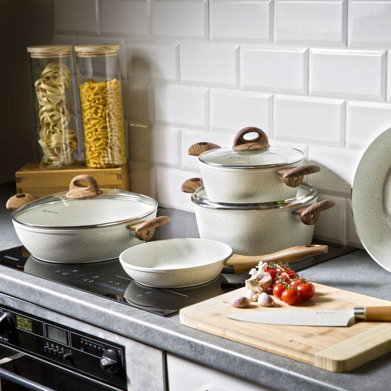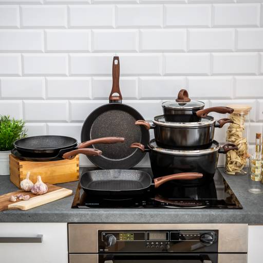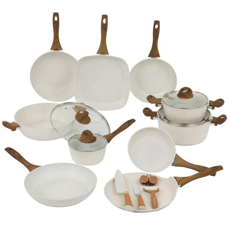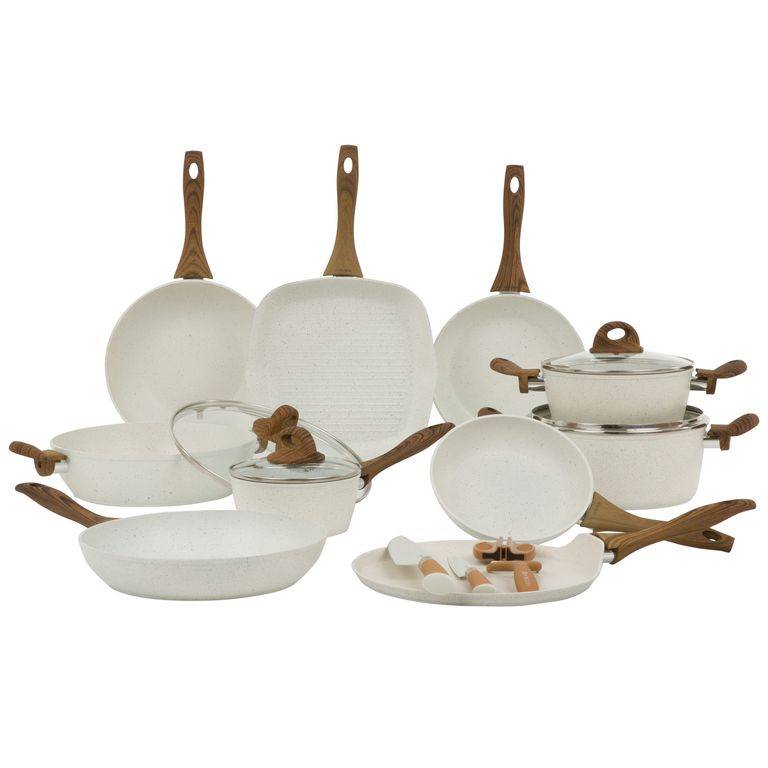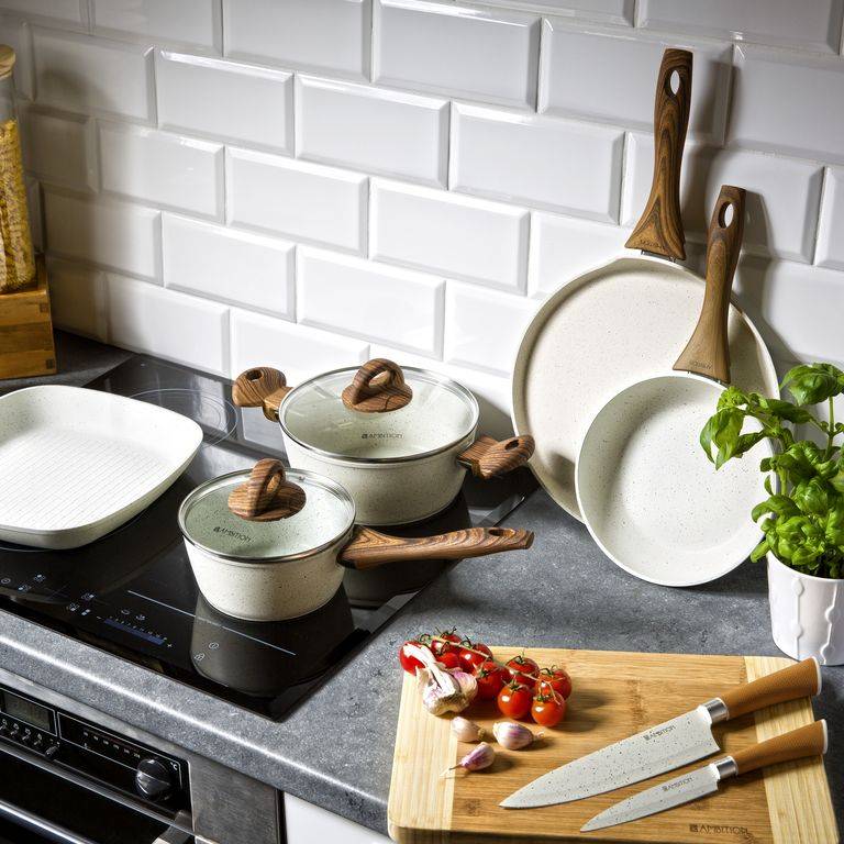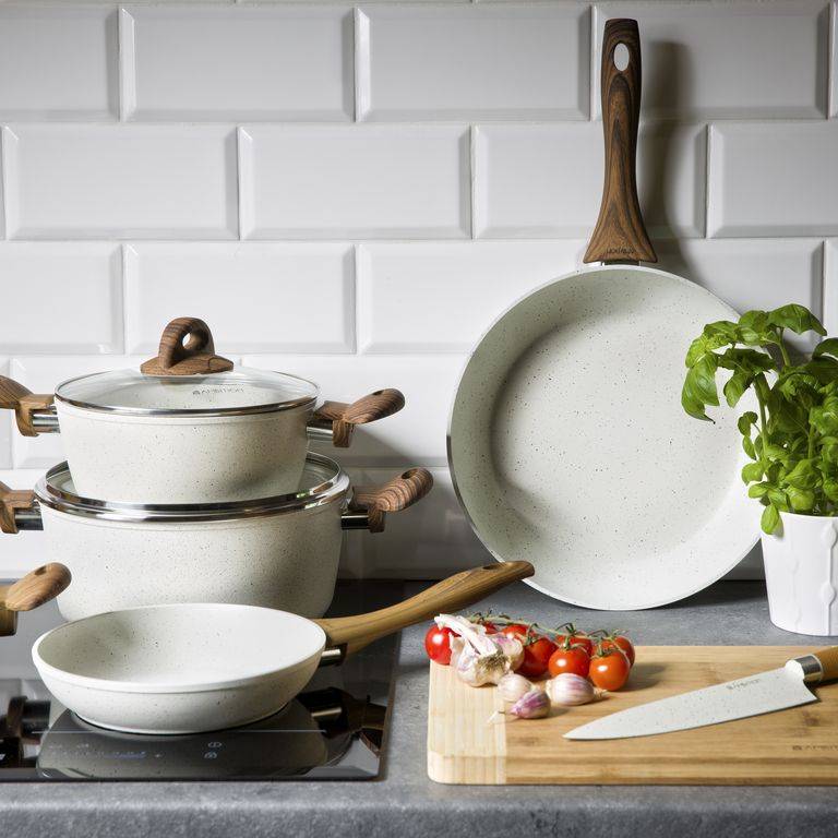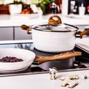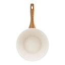 - Naturalny design: jasne naczynia z powłoką imitującą kamień oraz uchwytami w kolorze drewna wprowadzają do kuchni harmonię i nowoczesny styl