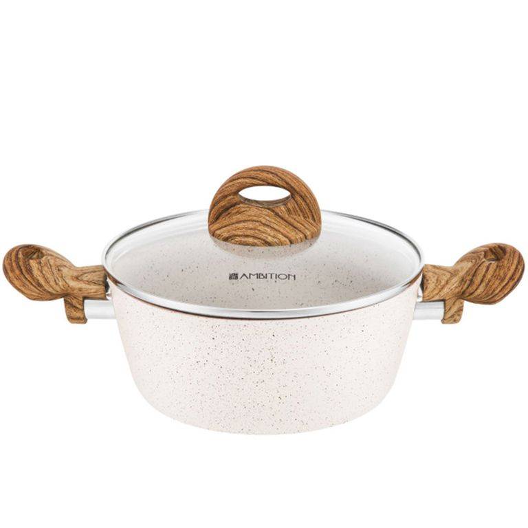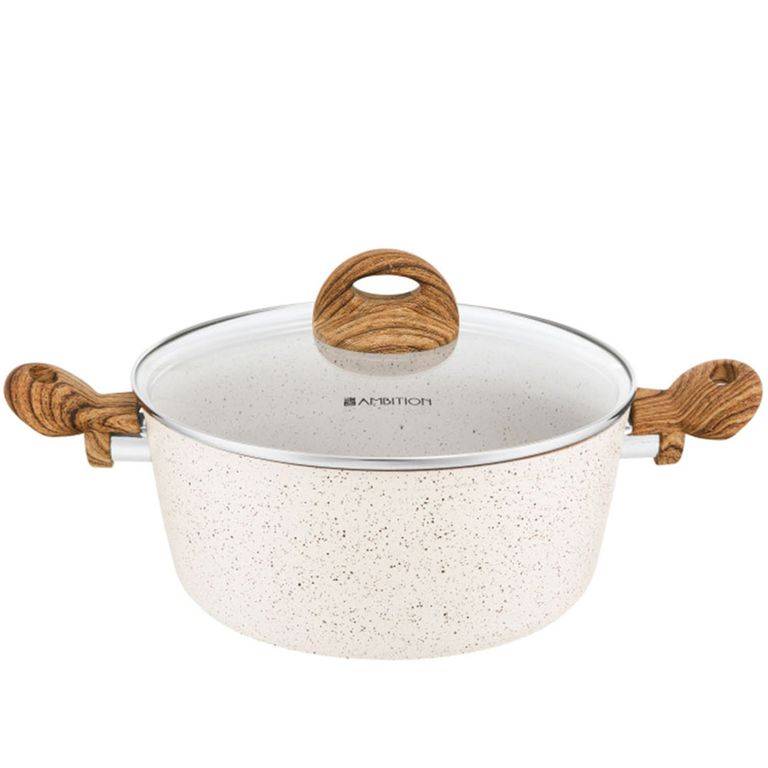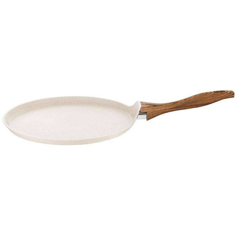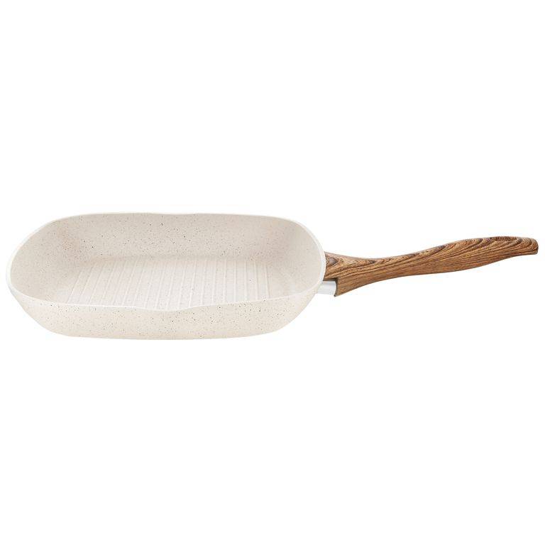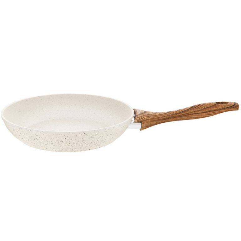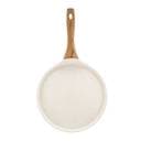 - Naturalny design: jasne naczynia z powłoką imitującą kamień oraz uchwytami w kolorze drewna wprowadzają do kuchni harmonię i nowoczesny styl