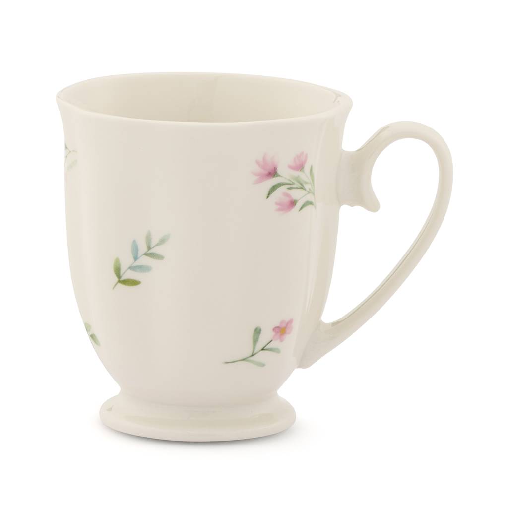 Subtelne, drobne kwiaty zdobią powierzchnię kubka, nadając mu lekki i romantyczny charakter. Dekoracja wprowadza do aranżacji stołu świeżość oraz naturalny akcent.