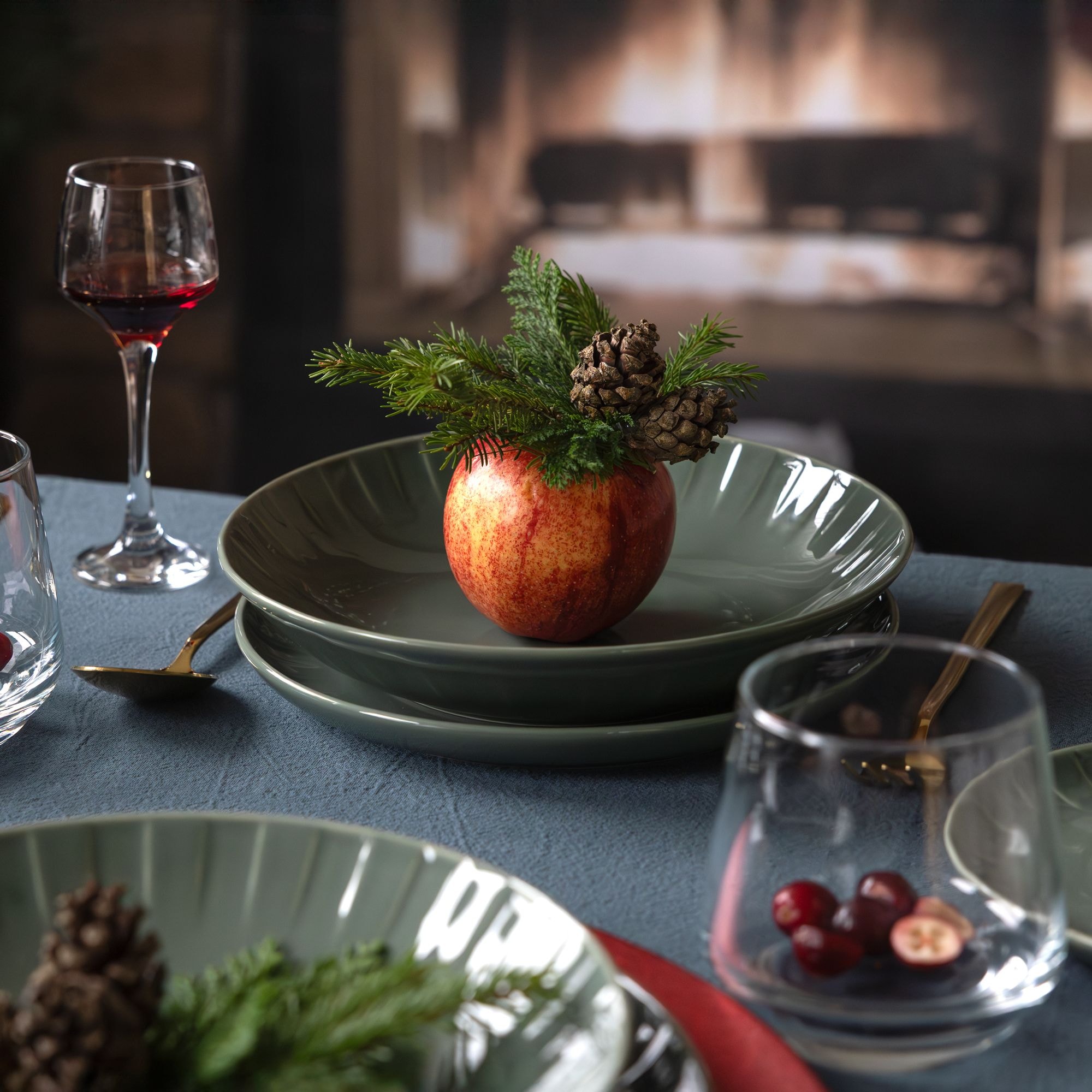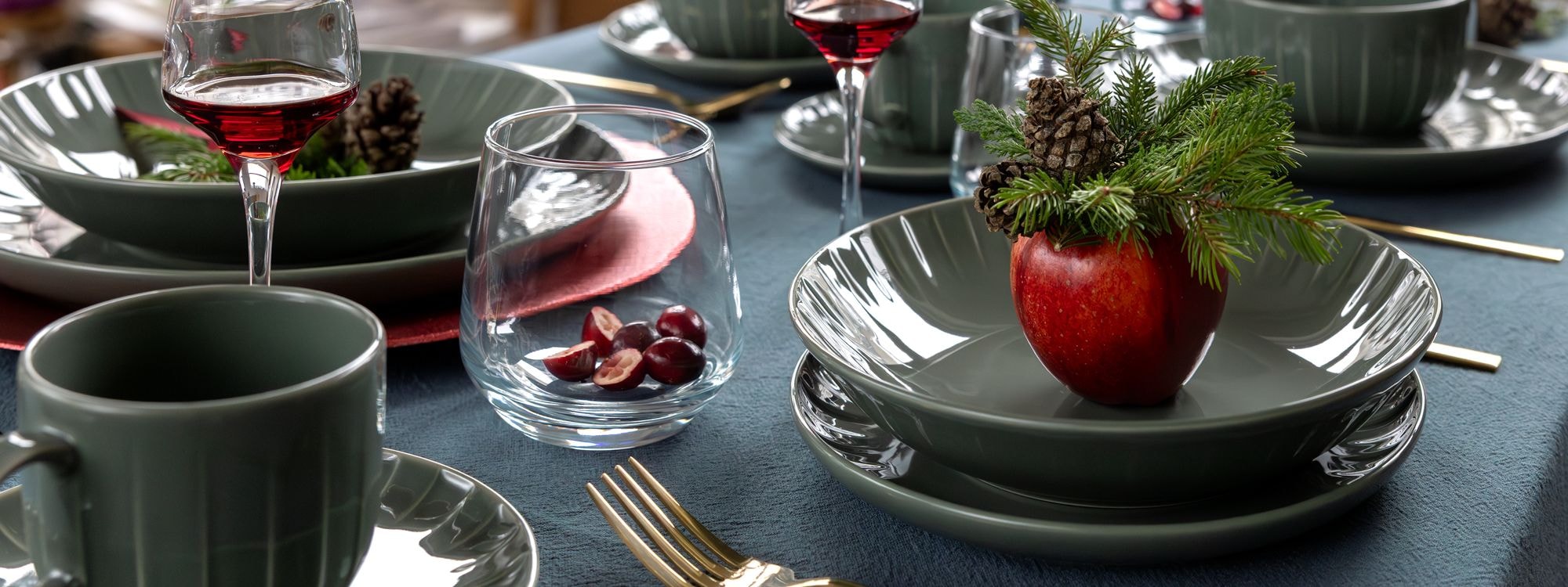 Zielona zastawa Ligne, dzięki swojej głębi i gładkiej powierzchni, sama w sobie jest dekoracją. Aby jednak w pełni wydobyć jej urok i dopasować ją do świątecznej atmosfery, musimy odpowiednio dobrać towarzyszące jej barwy i tekstury.