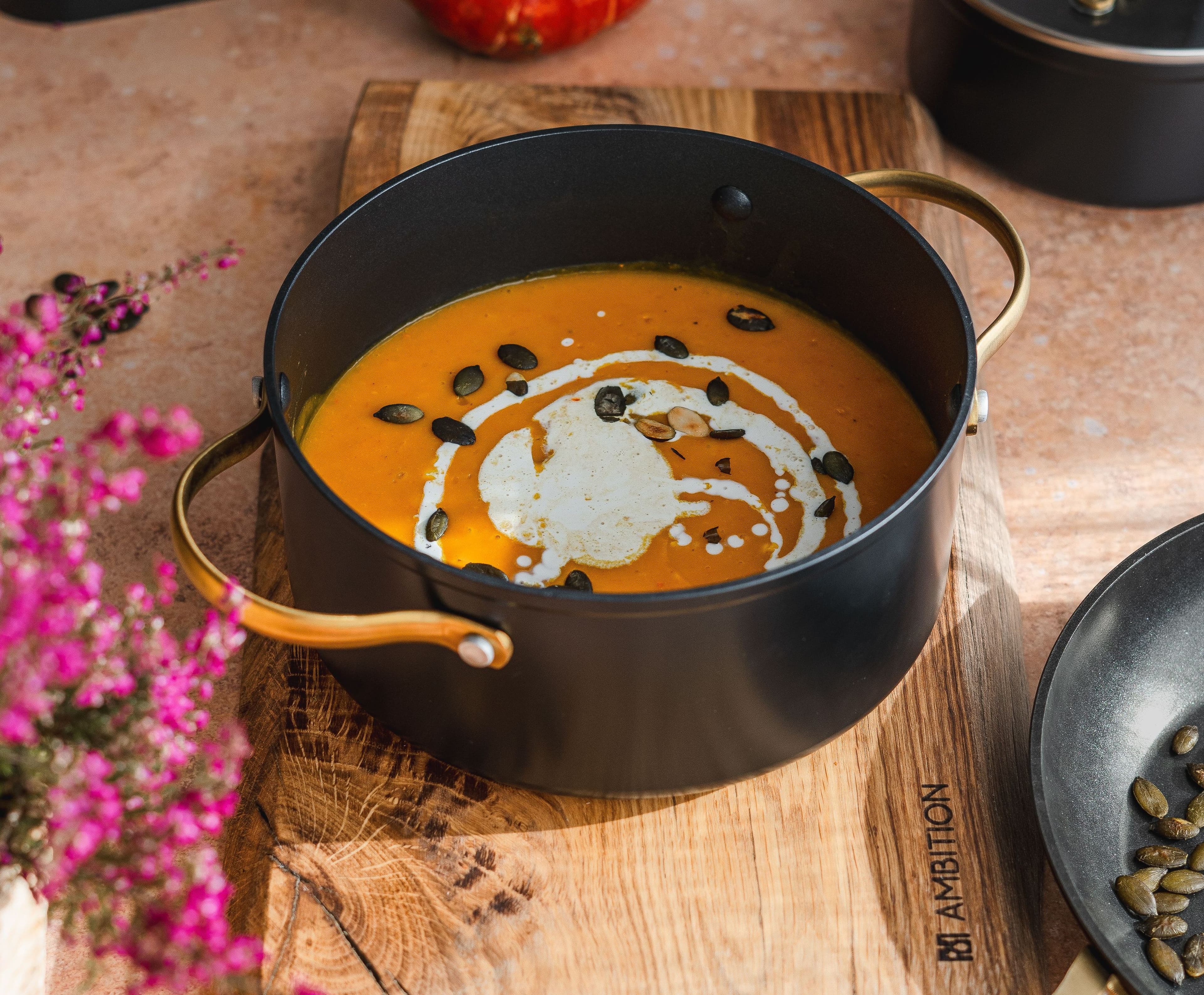 Garnki z kolekcji Royal wykonane są z grubego aluminium z powłoką nieprzywierającą, co pozwala uzyskać równomierne i łagodne gotowanie warzyw, dzięki temu smak dyni nie przypala się i zupa zyskuje naturalną słodycz.