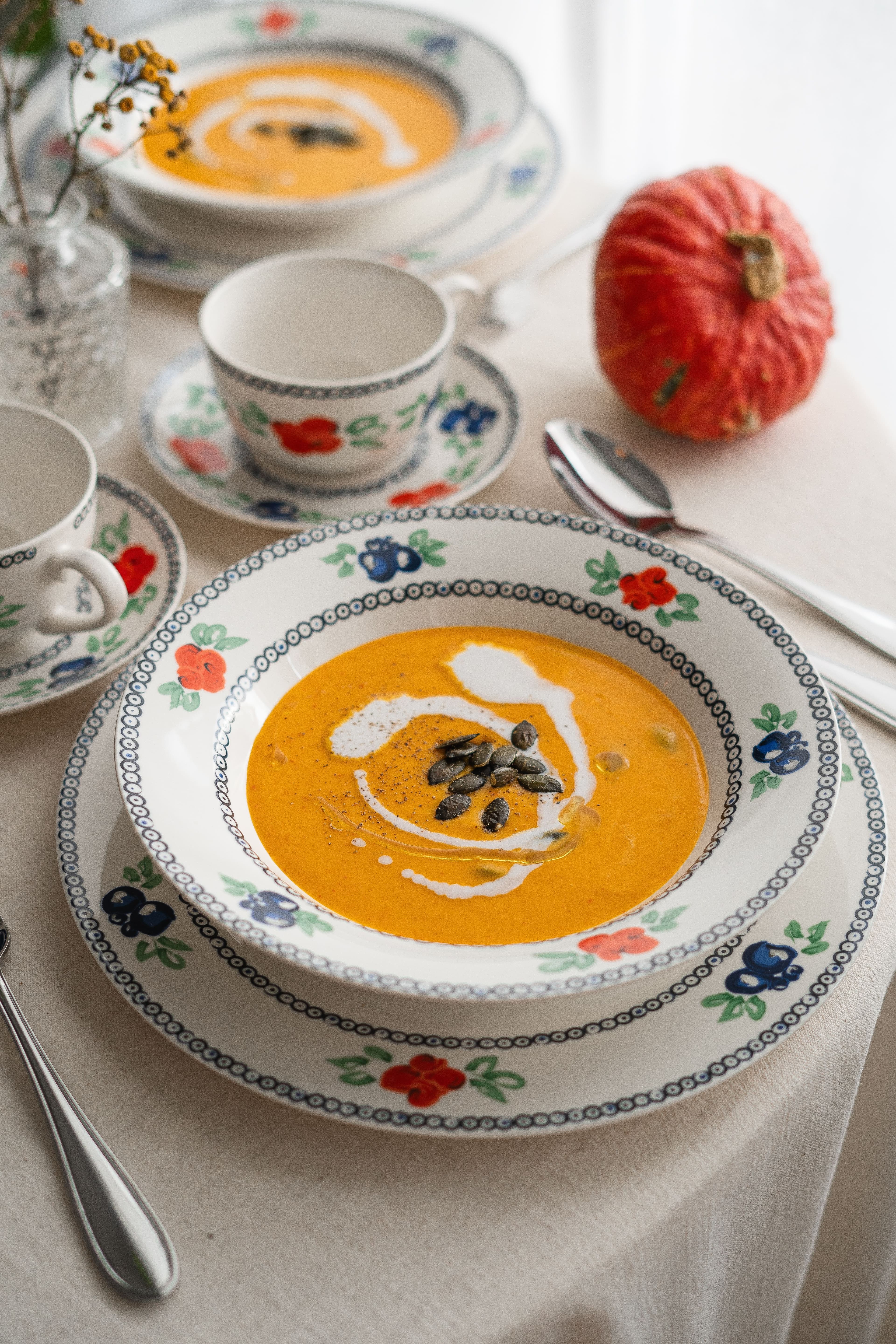 Podawaj gorącą zupę krem z dyni w głębokich talerzach.